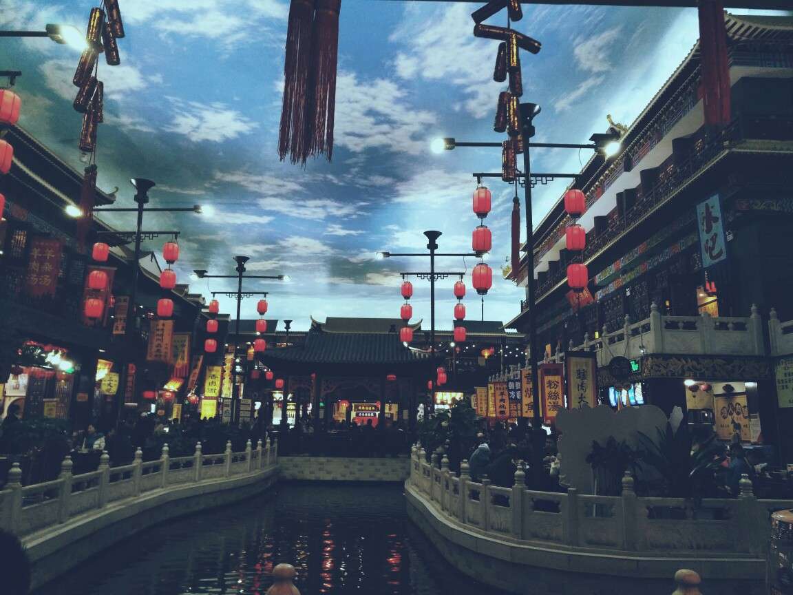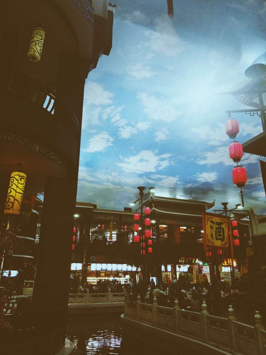 抬起頭,房頂噴繪的藍天白云,加上周圍小吃攤販身上的古裝,制作木板年畫的老師傅縱橫的皺紋,以及路邊一排繡娘手中的銀針,讓來者一時忘憂。
