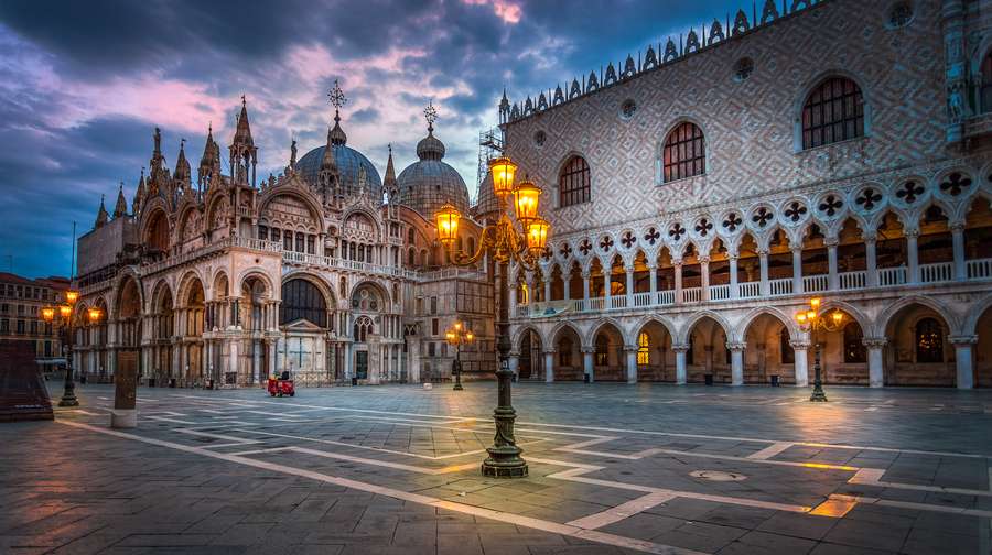 巍峨壯觀的圣馬可大教堂坐落于廣場東邊,圣馬可廣場即由此而得名。教堂始建于公元829年,為千年的古跡瑰寶,值得游客一再走訪。鄰近的總督府原是建于9世紀的防御堡壘,后毀于祝融,現存的外貌始于14至15世紀,其建筑之華麗,充分展現出昔日共和國時期之國威。大運河環繞該區而流,在南彎道兩旁府邸林立,乘船游河能遍覽水都風華。