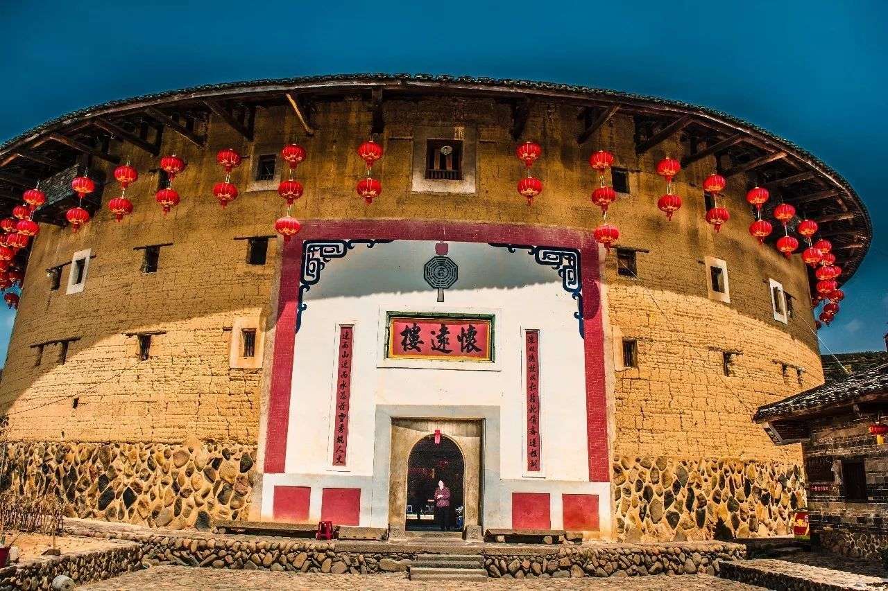 懷遠樓是雙環圓形土樓,簡氏家庭住宅,建于清宣統元年(1909年),坐北朝南,占地1384.7平方米,高4層,1 4.5米,每層34間,共136間。樓門上有楹聯“懷以德敦以上藉此修齊遵祖訓,遠而山近而水憑茲靈秀育人文”。懷遠樓最引人注目之處,在于內院核心位置的祖堂也就是家族子弟讀書的地方“斯是室”。