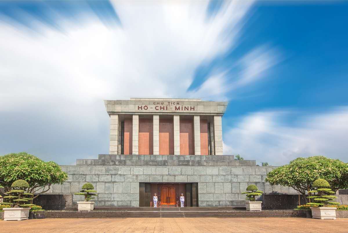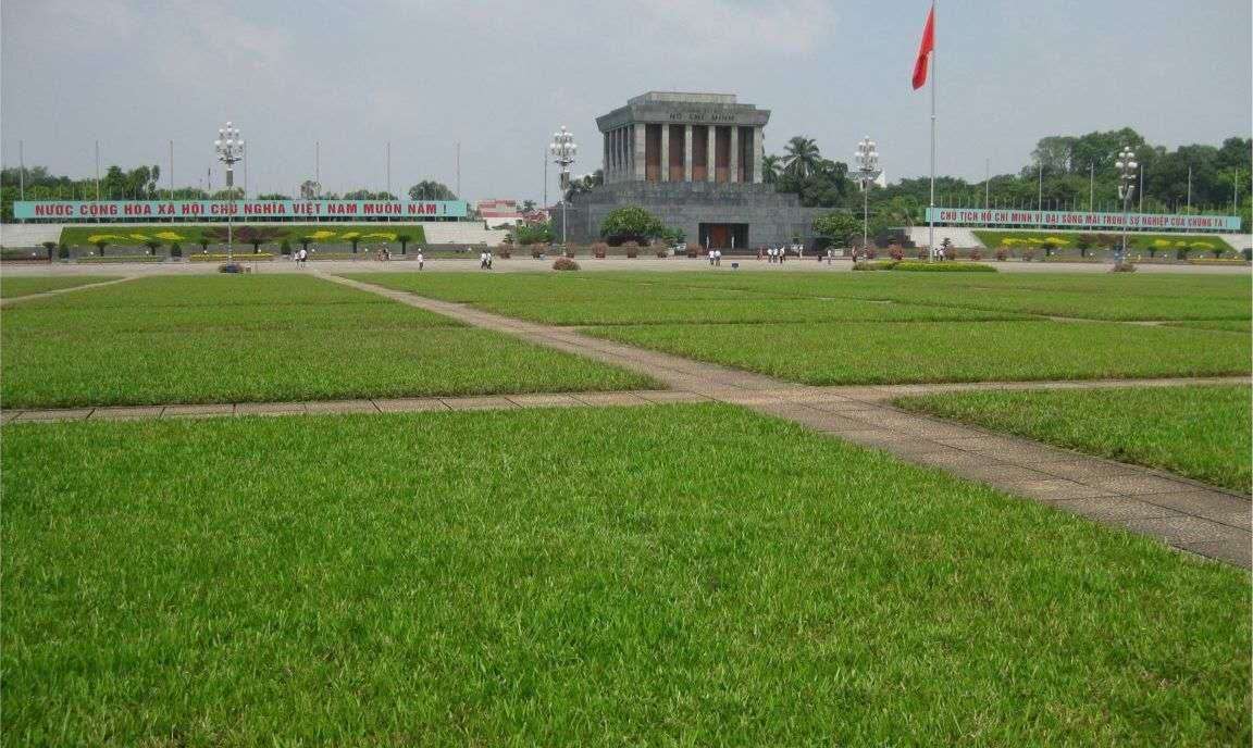 廣場西側(cè)為胡志明主席陵,東靠巴亭會堂,四周綠樹縈繞,建筑圍拱如壁。