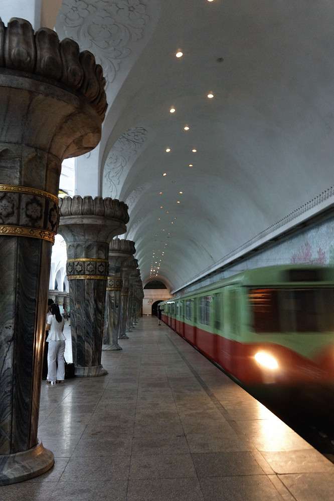 平壤地鐵是在中國的援助下于1968年開始興建的,當年北京的地鐵也剛開始動工。1973年剛通車時,地鐵采用的部分車廂還是中國長春客車廠的產品。可以說,平壤地鐵是中朝友誼的又一個見證。現在,平壤市內一共有兩條地鐵,呈十字交叉形,貫通全城東西南北,總長40公里,日均客流量達到40萬人次。