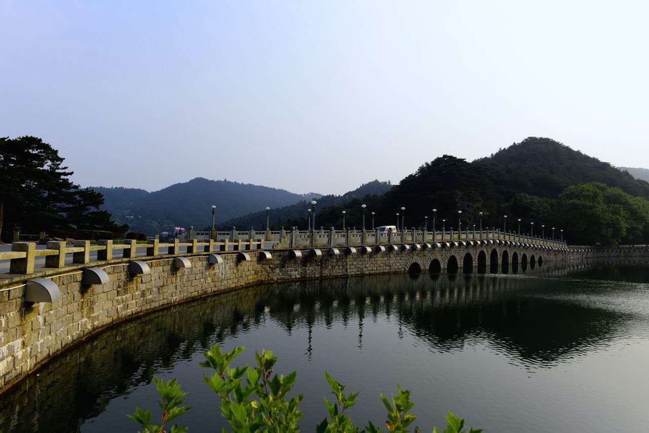 從黃龍寺沿石階曲徑上行約20分鐘,便到蘆林大橋。一路密林蔽日,樹干高聳挺拔,夏日人行其間頗感涼爽。蘆林大橋高30米,橋壩一體,攔水成湖,湖水如鏡,似發光的碧玉鑲嵌在林蔭秀谷之中,在縹緲的云煙襯托下美麗。