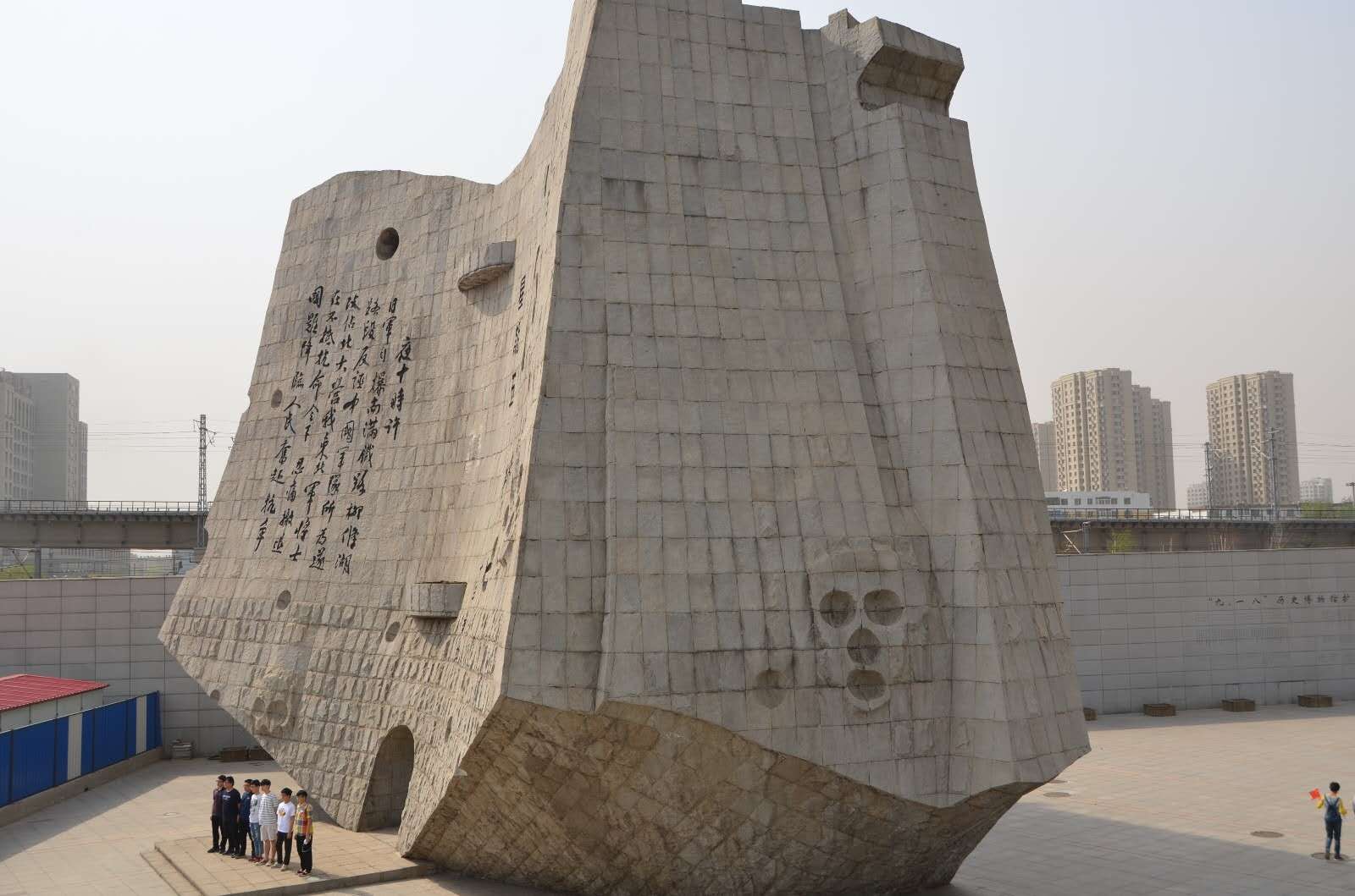 “九·一八” 歷史博物館館內的“九·一八”事變紀念碑,為磚石水泥筑成的空心體,紀念碑從平面上看其形狀是一幅巨大的東北地圖,版權所有山東聊城聊之旅國際旅行社有限公司,轉載必究!前方有一幾何形的廣場,底座四周為不規則的綠色草坪所圍繞,整個建筑高十八米,寬三十米,厚十一米,用混凝土鑄成,花崗巖貼面,呈立體臺歷狀,兩邊對稱,上面布滿彈痕與骷髏,臺歷的左面刻著“1931年 9月18日”,右面記錄著事變的發生過程。