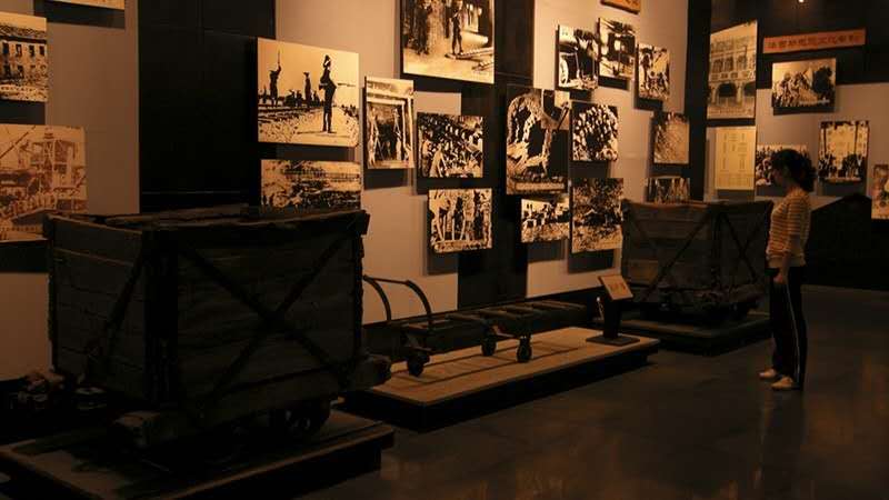 運尸車:該運尸車長約200厘米,高約120厘米,鐵制,有3只車輪。這種運尸車,是日本侵略者用來運送被他們殘酷的盤剝壓榨,苦力折磨和殘暴的肉體刑罰而悲慘死去的無數中國人尸體的工具。