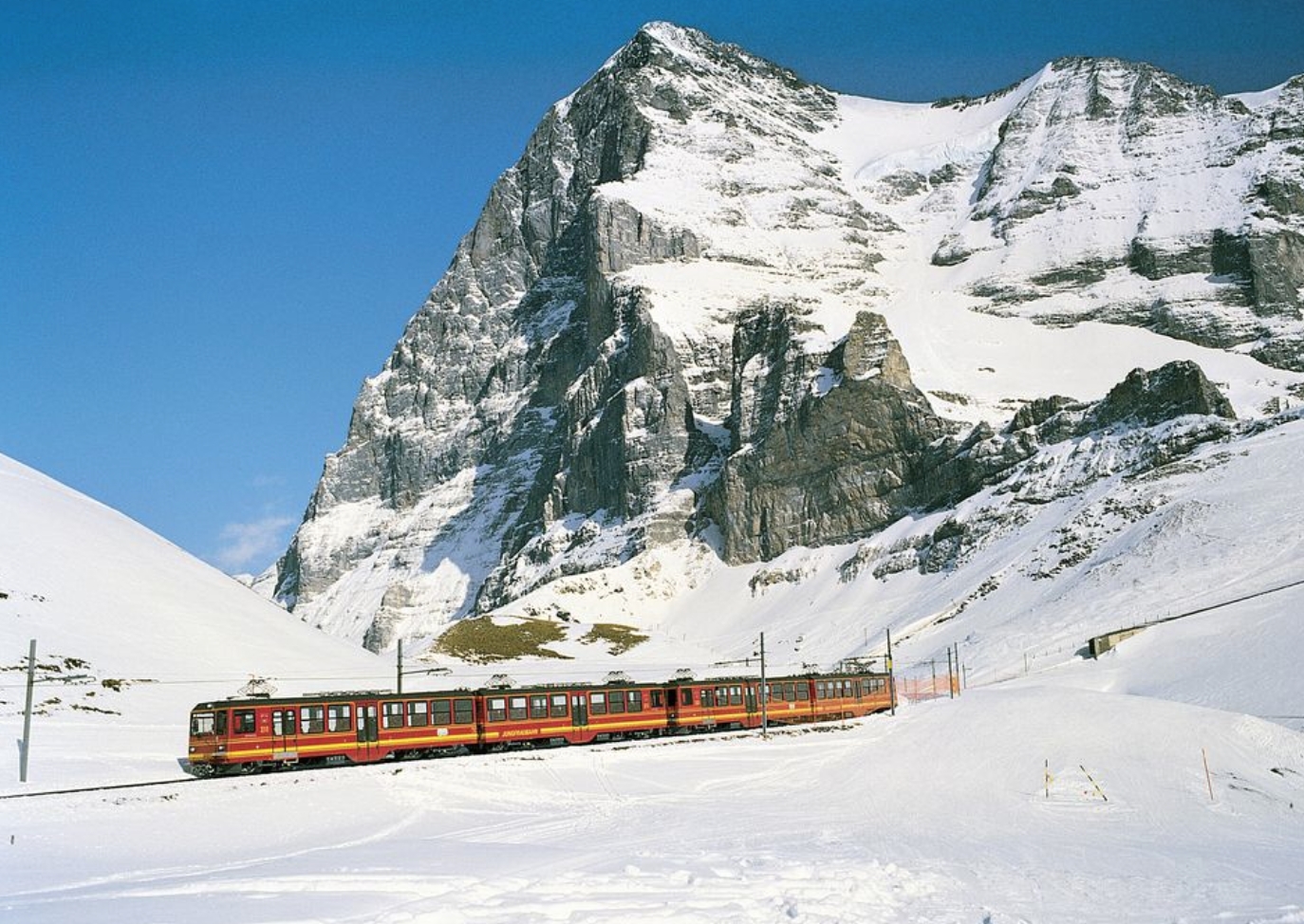 少女峰于1811年才首次由Meyer 兄弟征服。20世紀初少女峰鐵路(Jungfraubahn)建成,用隧道及齒軌鐵路連接少女峰旁,3,454米(11,333呎)高的小少女峰(Jungfraujoch)。位于小少女峰山內的車站亦為歐洲最高的火車站,有“歐洲之巔”之稱。少女峰鐵路由山下Grindelwald 開始,婉延經過Eiger 的草地,于Kleine Scheidegg 進入隧道。于堅固的花崗巖內的隧道雖然只長7 公里,坡度卻達到25%,于1898-1912年花了14年才完成,它有四分之三左右的路段是在冰河底下隧道巖壁里通過,工程十分艱巨。由Kleine Scheidegg 到少女峰車站,上山需時約50分鐘,下山則需要35分鐘。