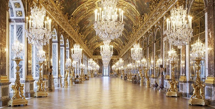 鏡廳曾被廣泛認(rèn)為是無(wú)上權(quán)力的象征,1678年路易十四讓他的建筑師兼城市規(guī)劃師芒薩爾為凡爾賽宮設(shè)計(jì)了最豪華瑰麗的殿堂鏡廳。廳內(nèi)長(zhǎng)廊一側(cè)是17扇朝花園而開(kāi)的巨大拱形窗門。版權(quán)所有山東聊城聊之旅國(guó)際旅行社有限公司,轉(zhuǎn)載必究!另一側(cè)是由483塊鏡片鑲嵌而成的17面落地鏡,它們與拱形窗門一一對(duì)稱,把門窗外的藍(lán)天、景物完全映照出來(lái)。同時(shí)廳內(nèi)3排掛燭上32座多支燭臺(tái)及8座可插150支蠟燭的高燭臺(tái)所點(diǎn)燃的蠟燭,經(jīng)鏡面反射,形成約3000支燭光,把整個(gè)大廳照得金碧輝煌。當(dāng)時(shí)鏡廳是宮廷舉行大型招待會(huì)和國(guó)王接見(jiàn)高級(jí)使團(tuán)的場(chǎng)所,而整個(gè)凡爾賽宮則成為國(guó)王和貴族、大臣們飲酒作樂(lè),享受豪華奢侈生活的場(chǎng)所。