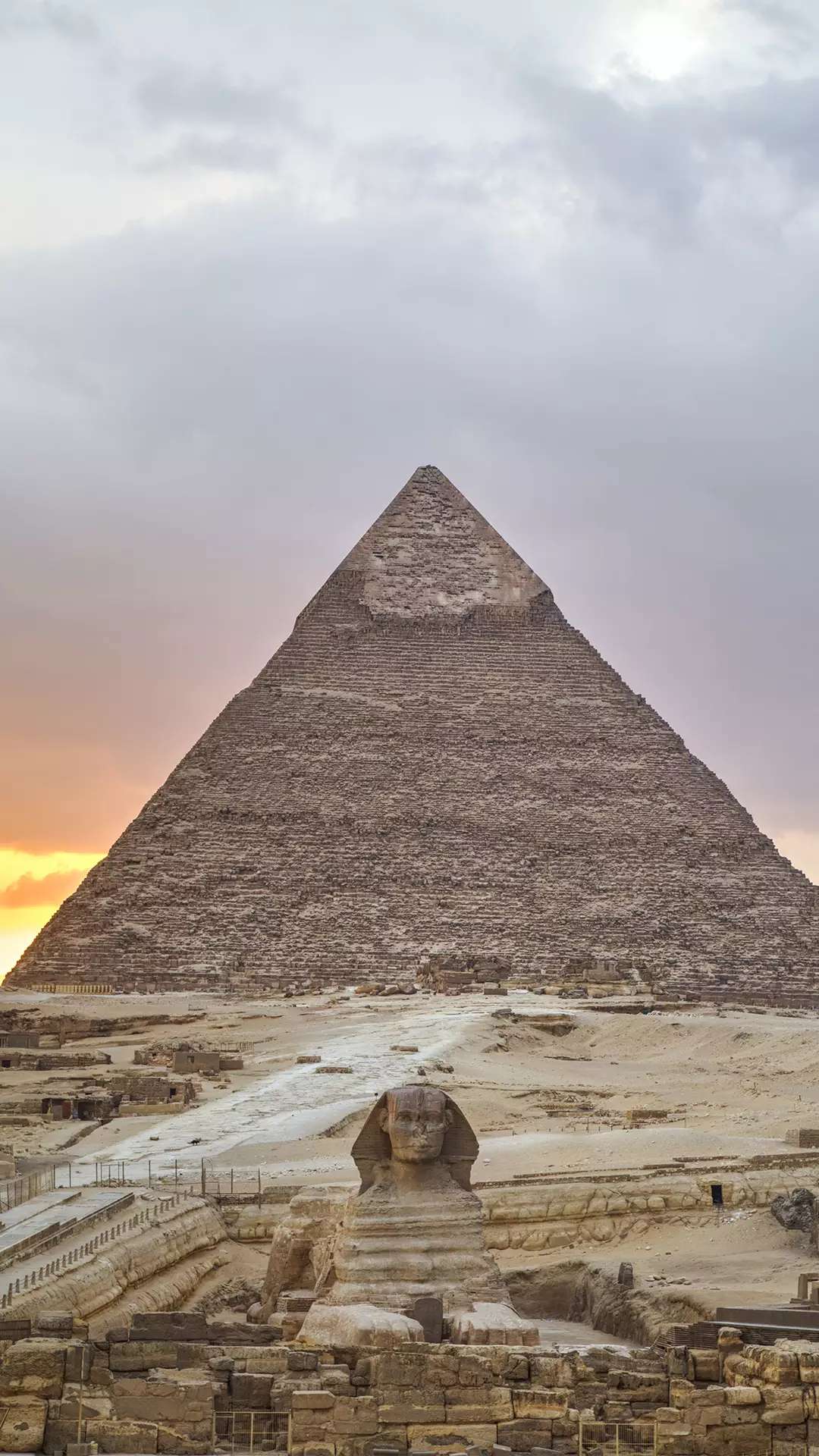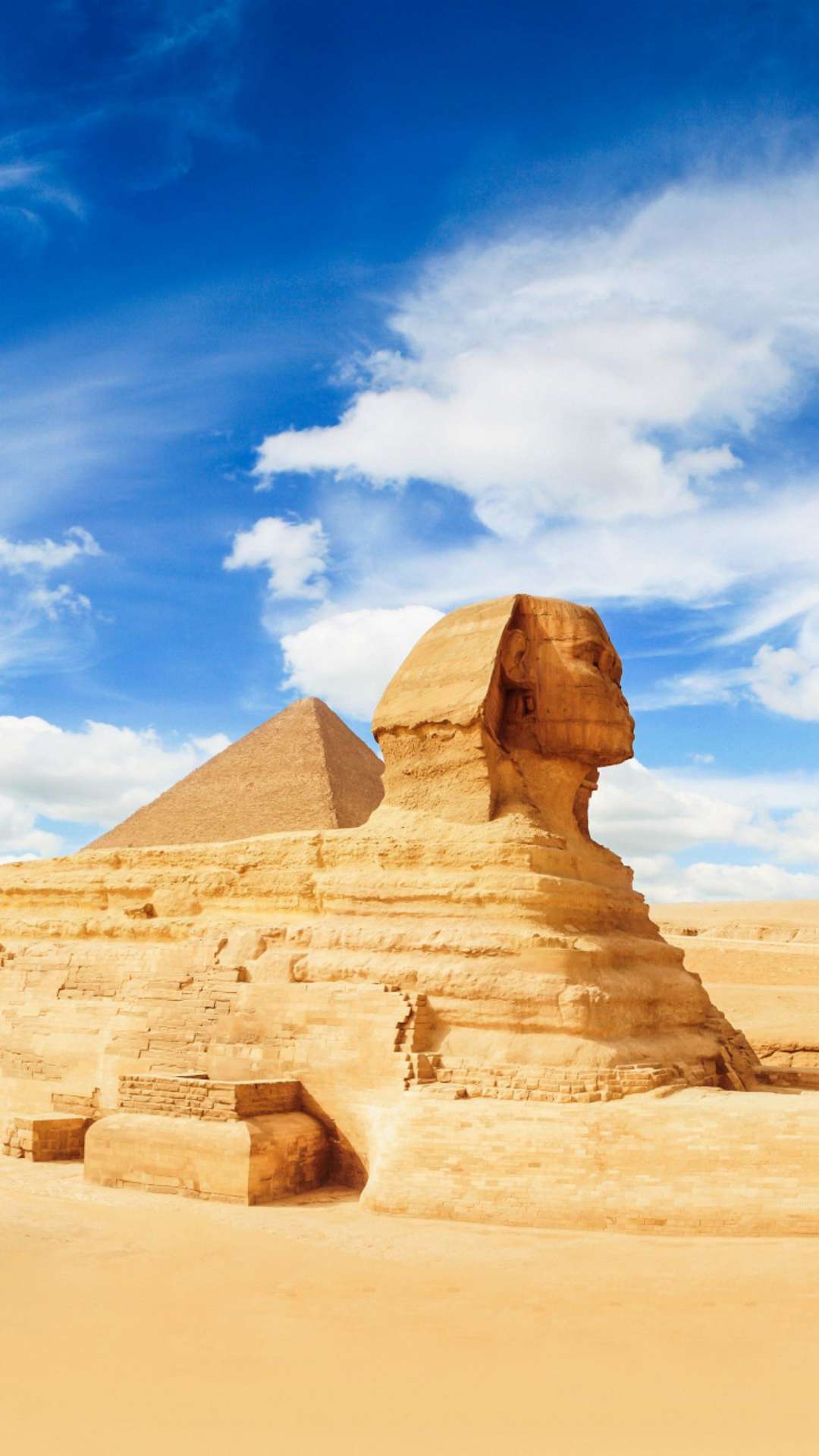 獅身人面像(又譯“斯芬克斯” sphinx)坐落在開(kāi)羅西南的吉薩大金字塔近旁,是埃及著名古跡,與金字塔同為古埃及文明最有代表性的遺跡。像高21米,長(zhǎng)57米,耳朵就有2米長(zhǎng)。除了前伸達(dá)15米的獅爪是用大石塊鑲砌外,整座像是在一塊含有貝殼之類雜質(zhì)的巨石上雕成。面部是古埃及第四王朝法老(即國(guó)王)哈夫拉的臉型。相傳公元前 2611年,哈夫拉到此巡視自己的陵墓——哈夫拉金字塔工程時(shí),吩咐為自己雕鑿石像。工匠別出心裁地雕鑿了一頭獅身,而以這位法老的面像作為獅子的頭。在古埃及,獅子是力量的象征,獅身人面像實(shí)際上是古埃及法老的寫(xiě)照。雕像坐西向東,蹲伏在哈夫拉的陵墓旁。由于它狀如希臘神話中的人面怪物斯芬克斯,西方人因此以“斯芬克斯”稱呼它。