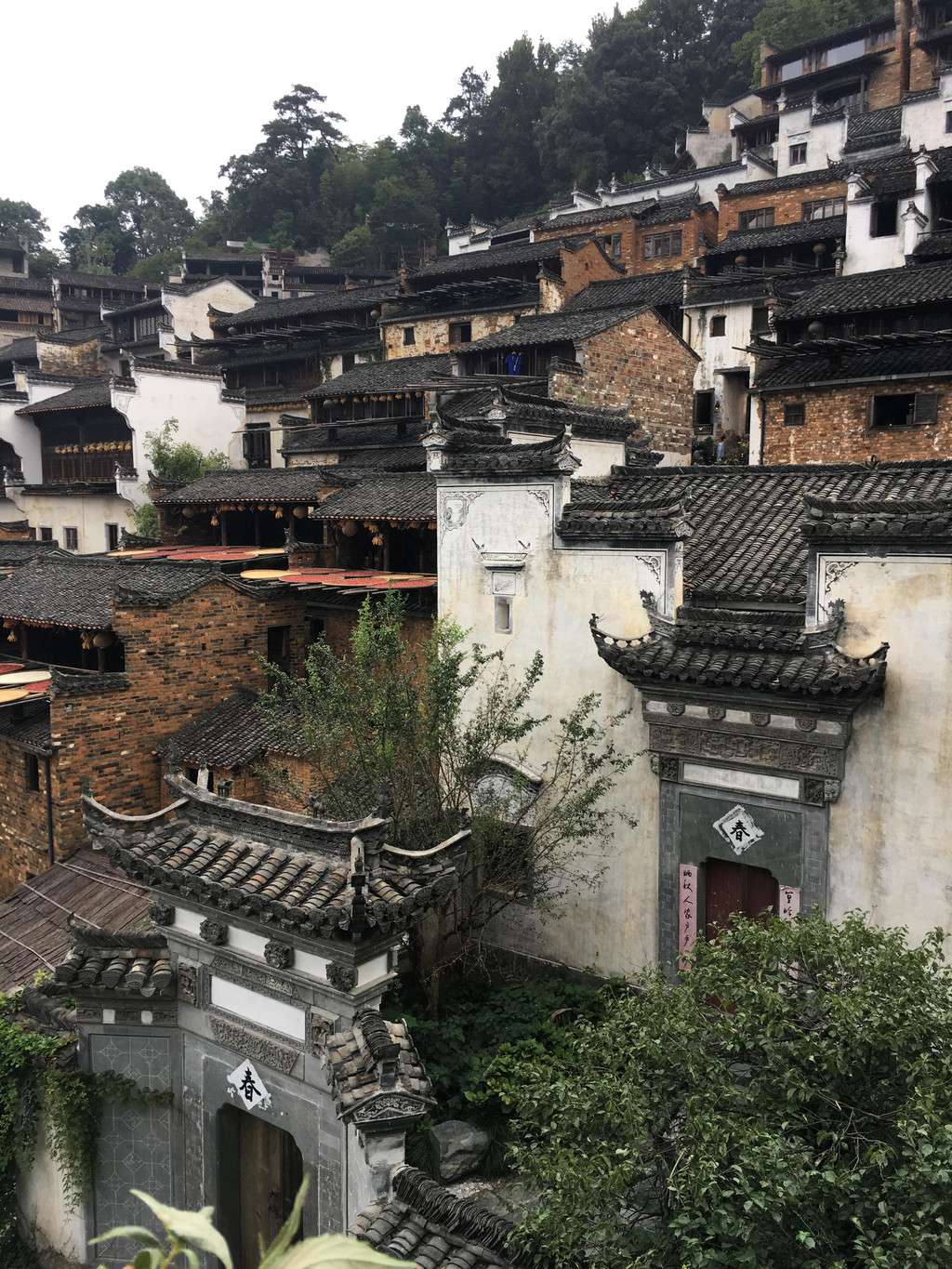 徽州古村很重視村莊布局,講究風水。篁嶺古村依照“天街九巷,三橋六井”布局建設。篁嶺天街長388米,橫貫東西,九條巷道由天街分支,延展至村莊的各個角落。天街是篁嶺的“商業一條街”,兩邊商鋪林立,各種該地特色的業態在此匯聚:這里有婺源三雕之一的木雕在現場雕刻、修復,有民間藝人制作竹編用品,工藝畫傘,現場作畫等。在天街可以品嘗婺源小吃如蒸汽糕、清明果、霉干菜扣肉燒餅、豆腐腦、臭豆腐……也可以品嘗自獵、自種、自養的“天街農家宴”。