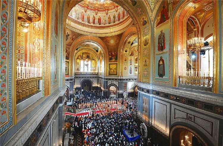 室內的壁畫與圣像畫經過細心雕琢的裝潢,制造出壯闊的空間感。另外,莊嚴的壁畫和圣像畫描述著拿破侖戰役與東正教的勝利。1887年最終啟用的這座大教堂是莫斯科最大的教堂,有5個鍍金的蔥頭狀圓頂,中央圓頂高102米。