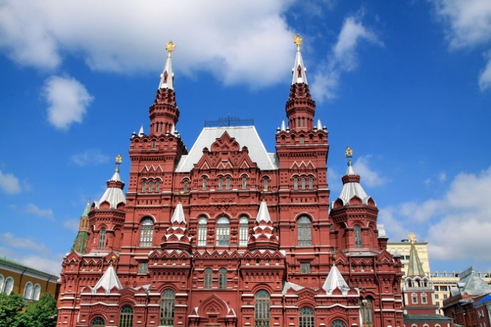 俄羅斯國家歷史博物館(The State Historical Museum)位于俄羅斯莫斯科紅場北側(cè)的馬涅什廣場上,是一座建筑造型非常美麗且極具新俄羅斯風(fēng)格的朱紅色建筑物;在主體建筑物的兩側(cè)各有一座高聳對稱的塔樓,還有裝飾性的尖塔、三角檐與圓拱型窗戶。