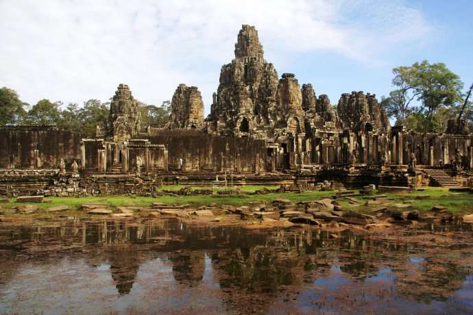 巴戎廟 位于柬埔寨暹粒,吳哥城內最為出名的要數巴戎廟中的佛塔了,巴戎廟位于吳哥城的中心位置,巴戎廟是由一組共49座小寶塔圍繞中央尖塔構成的建筑群,這些塔在佛語里又被稱做浮屠,每一座塔的四面都雕刻著巨大的佛面,也正因為如此,這些塔又被稱作佛面塔,上面的佛被稱為四面佛。