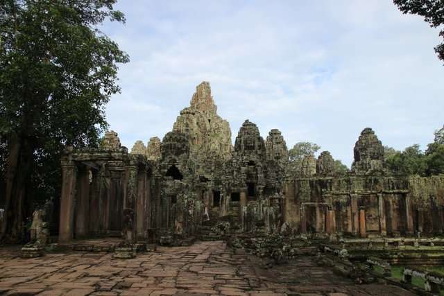 在茂密的叢林中,千回百轉,灰白的石柱后,一個又一個黑白相間的斑駁石塔讓人又重回古代神秘圣土,四面佛那慈祥安定的臉部透出一份寧靜與優雅的神秘,拾起記憶的殘片,體會時光交錯的震撼……