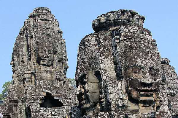 巴戎廟 位于柬埔寨暹粒吳哥城內最為出名的要數巴戎廟中的佛塔了,巴戎廟位于吳哥城的中心位置,巴戎廟是由一組共49座小寶塔圍繞中央尖塔構成的建筑群,這些塔在佛語里又被稱做浮屠,每一座塔的四面都雕刻著巨大的佛面,也正因為如此,這些塔又被稱作佛面塔,上面的佛被稱為四面佛。