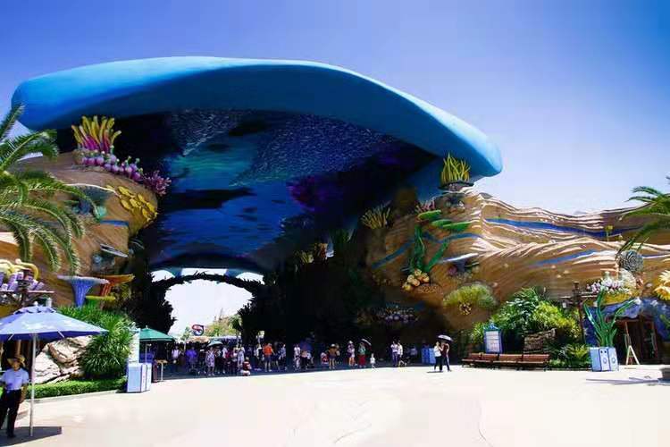 海洋館的流線外型十分獨特,猶如一顆閃爍異彩的海洋明珠,長隆海洋王國的地標——高達63米、約18層樓高的巨型藍色鯨鯊雕像就矗立在這里,非常震撼。這里是世界最大的海洋魚類展覽館,水體3.1萬立方,比目前世界上最大、水體為1.5萬立方的水族館水體還超出一倍之多。