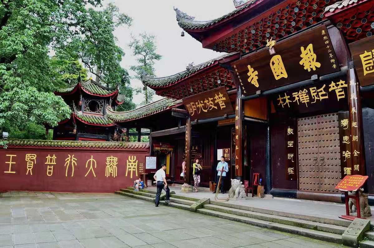 山門的“報(bào)國(guó)寺”大匾,是清康熙皇帝御題,王藩手書。正殿懸有“寶相莊嚴(yán)”匾。山門兩邊柱上那副對(duì)聯(lián)“鳳凰展翅朝金闕,鐘磬頻聞落玉階。”就是對(duì)報(bào)國(guó)寺這只“金鳳凰”周圍景物的生動(dòng)描寫。橫匾“普照禪林”和“普放光明”,同是一個(gè)意思:佛教稱峨眉山為“大光明山”,晝有神奇的佛光出現(xiàn),夜有萬(wàn)盞圣燈來(lái)朝,全峨眉山都被光明普照。右邊“鶴駐云歸”,意為鶴停下了,云歸山岫,喻指清涼靜地,含有道家韻味。大門上的聯(lián)語(yǔ):“獨(dú)思喻道,敷坐說(shuō)經(jīng)。”前者是說(shuō)靠自己的思維明白佛經(jīng)的道理,就是佛學(xué)講的“獨(dú)覺”境界。后句是說(shuō)高僧大德鋪設(shè)好法座向弟子講經(jīng)說(shuō)法。