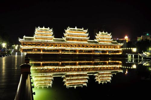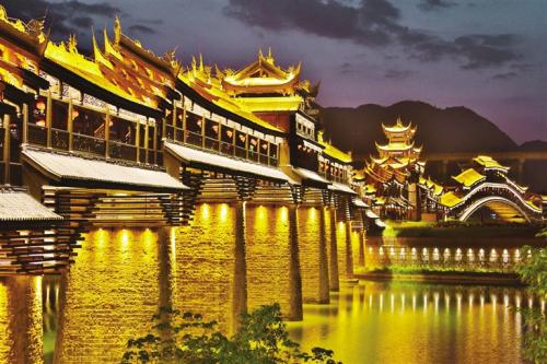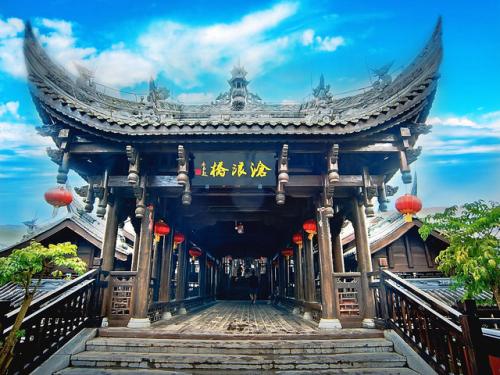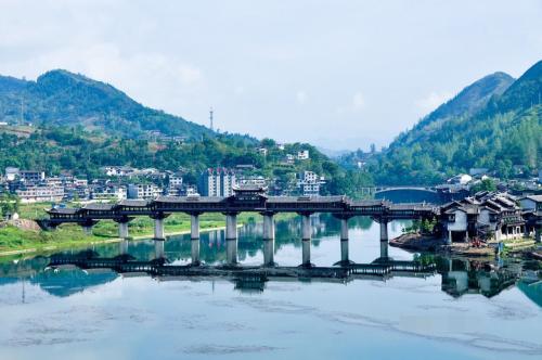 黔江濯水古鎮風雨橋橫跨于阿蓬江上,長303米、寬5米,據說是亞洲最長的廊橋,分為橋、塔、亭三部分。濯水古鎮風雨橋橋身為純木制結構,建筑材料之間以榫頭卯眼互相穿插銜接,直套斜穿,結構牢固精密。橋建有三層塔亭,兩側有約百扇可自由開合的雕花木窗,橋內擺放有紅漆長凳。