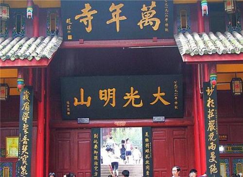 在萬年寺一帶,山民村舍錯落,宛如一幅恬靜的山鄉景色畫圖。萬年寺是峨眉山八大寺廟之一,創建于晉,稱普賢寺,唐時改名白水寺,宋時為白水普賢寺。
