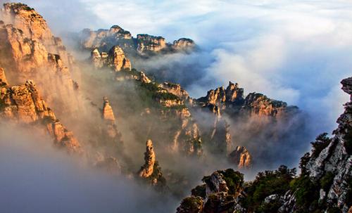 白石山位于太行山的最北端,最高峰佛光頂海拔2096米,登臨其頂可以遠眺狼牙山和五臺山。白石山景觀多樣,集峰林、怪石、絕壁、峽谷、瀑布、森林、云海、佛光、長城、廟觀等景觀于一體,地貌奇特,結構復雜,是中國古代“三十六洞天福地”之一。