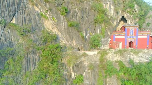 是當年蘇元春將息之所。依洞設景,別有天地。宮門進處,洞廳暢明,石刻滿壁。“古洞長春”其左,“奠麗南邦”其右,書藝精湛,分外醒目。左洞上去,是一道朱門,雕龍刻鳳,氣宇軒昂。額題:“玉闕”。對開耳門,號曰“金階”。巨幅壁刻云,“遙通帝座”。沿“金階”上去,見一座金門,稱為“天闕”。左設左禁門,右置右禁門。洞府正中,一把巨大的石傘之下,數株石筍,宛若數名仙女,簇擁“天帝”。回首身后,一道強光從高遠之處,穿山而下,那湛藍的天穹,恰似一面奪目的寶鏡,陽光就從那里直照到"天帝"的寶座之前。真是奇光天外來,滿洞放異彩。從宮右往“天橋”走去,爬到高遠的洞口,回身展望,又看到一道彩墻,圖案精美,玲瑰透剔,額題“萬物資始”。自此俯瞰山下,清溪如帶,田垌鋪金,村落點點。“保元宮”,結構精美,金門重疊,朱戶畫墻,多彩多姿,真是富麗堂皇,勝似蓬萊。洞頂題詩云,“蜿蜒步上九重天,回首山河數點煙。如今方識保元妙,幾回夢魂到小連”。美妙的“保元宮”,確令游客駐足留連。