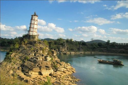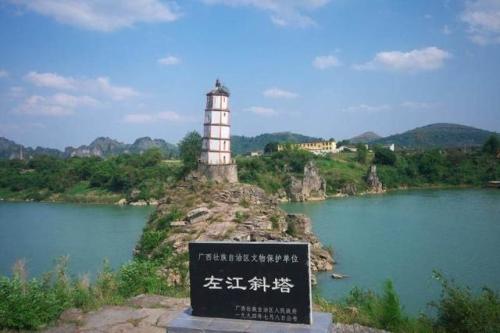 歸龍斜塔:又稱左江斜塔和水寶塔,位于廣西崇左市郊東北二公里處,建在左江中的石頭島——熬頭峰上,處于急灣激流之中,地勢驚險。