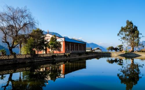老姆登教堂,青磚墻,紅漆木窗,白鐵皮屋頂,簡單樸素。從外表看,這座教堂并不壯觀,沒有常見的玻璃彩窗、穹頂、和標(biāo)志性的哥特式尖塔,有的只是長條凳和紅漆木窗,但這更顯出人們信仰的純粹和虔誠。每個(gè)星期天(周三、周六晚上八點(diǎn)亦有),周邊鄉(xiāng)村的基督教信徒都會集中在這里做禮拜,他們聚集在這里虔誠的念誦贊美詩,對于那些和著太陽和泥土味道的樸實(shí)的人民,上帝就住在他們心里,他們像呼吸一樣自然安詳虔誠的哼出那些歌謠。村民唱圣歌是用傈僳語唱的,傈僳族的文字始自圣經(jīng)的翻譯,也為怒族所共用。