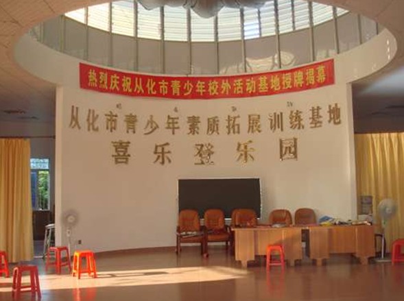 從化市喜樂登拓展訓練中心(青少年素質拓展訓練基地)座落在從化城郊紅旗村(距廣州約70公里,離從化市中心約15分鐘車程),占地350多畝。基地種有優質荔枝、龍眼、楊梅、黃皮等20多種果樹,各種本地特色農作物(紫心蕃薯、香芋、甜玉米等)以及上百種綠化植物,保持著濃郁的鄉村氣息。護城河邊、竹樓亭閣、果樹田園、風光無限、是一個集科普教育、果園旅游,配合青少年素質實踐教育為一體的實踐教育基地。