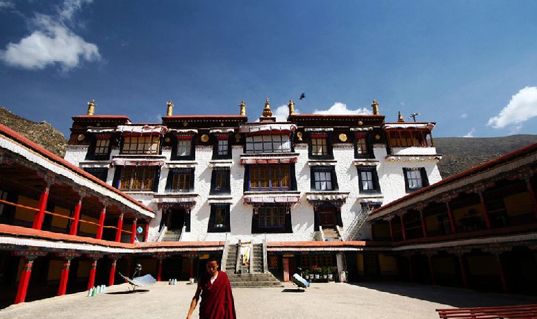 樓高3層,平頂宮堡式建筑,恢宏壯麗。殿內供有藏傳佛教格魯派創(chuàng)始人宗喀巴大師等人佛像,陳設豪華,供器甚多。明崇禎十五年(1642年),和碩特蒙古首領固始汗支持達賴五世打敗藏巴汗后,建立了格魯派統(tǒng)治政權,其政權機構即設于此。直到清順治五年(1648年)布達拉宮白宮建成,達賴五世由該處移居布達拉宮,政權機構也隨著轉移。后來,把格魯派統(tǒng)治的西藏地方政權統(tǒng)稱為甘丹頗章政權。