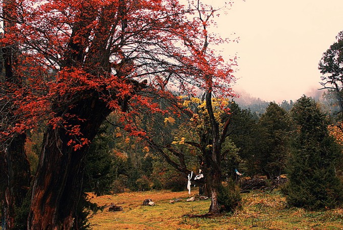 美麗的南伊溝離米林縣城有20公里,縱深40多公里,溝內(nèi)景色綺麗,有保護(hù)完好的天然原始森林和植被,既有高大的針潤(rùn)葉混交林,又有牧草豐盛的草甸。群山環(huán)抱,云霧繚繞,春天滿山的桃花杜鵑,秋天滿山的紅葉。景區(qū)內(nèi)有珞巴民俗村、藏藥觀賞園、千年云杉王、扎貢原始森林、甘露洞(藏醫(yī)藥鼻祖玉妥•云丹貢布大師行醫(yī)授徒之地)等景點(diǎn)。