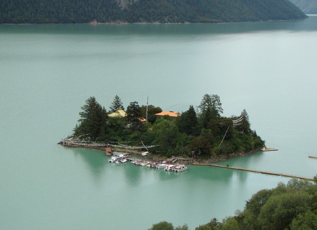 小島上有唐代的建筑“錯宗工巴寺”,是西藏有名的紅教寧瑪派寺廟,建于唐代末年,距今已有1500多年的歷史了。錯宗寺為土木結構,上下兩層,殿內主供蓮花生、千手觀音和金童玉女。寺南有一株桃和松的連理樹,春天時,桃花與青松相映,煞是好看。