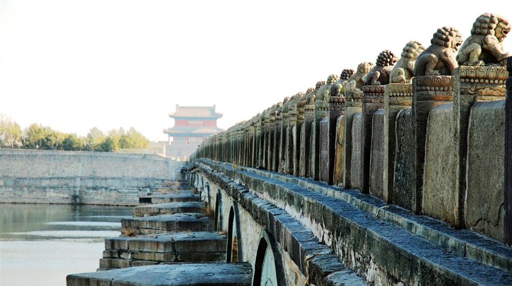 盧溝橋(Lugou Bridge)亦作蘆溝橋,在北京市西南約15千米處豐臺(tái)區(qū)永定河上。因橫跨盧溝河(即永定河)而得名,是北京市現(xiàn)存最古老的石造聯(lián)拱橋。盧溝橋全長(zhǎng)266.5米,寬7.5米,最寬處可達(dá)9.3米。有橋墩十座,共11個(gè)橋孔,整個(gè)橋身都是石體結(jié)構(gòu),關(guān)鍵部位均有銀錠鐵榫連接,為華北最長(zhǎng)的古代石橋。