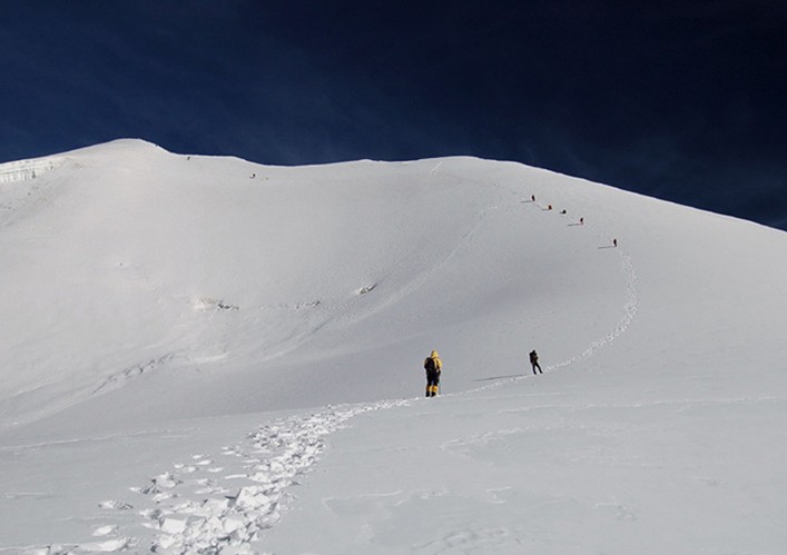 由于該峰各種坡度的地形都有,還有混合地形和垂直冰壁所以適合各種水平的人訓練,但初學者一定不要到超出自己水平的路線上去。1999年西藏隊的十四座隊的主力隊員仁那和加布,還有國際健將丹增多吉帶領二十名奧索卡學校的學生在這里進行訓練,他們從南面偏東的位置沿著山體直上,平均坡度在50度左右,到頂的時候更陡。走直上路線必須修路,山頂一段千萬別離山脊太近,那是雪檐和陡壁。