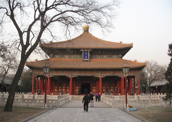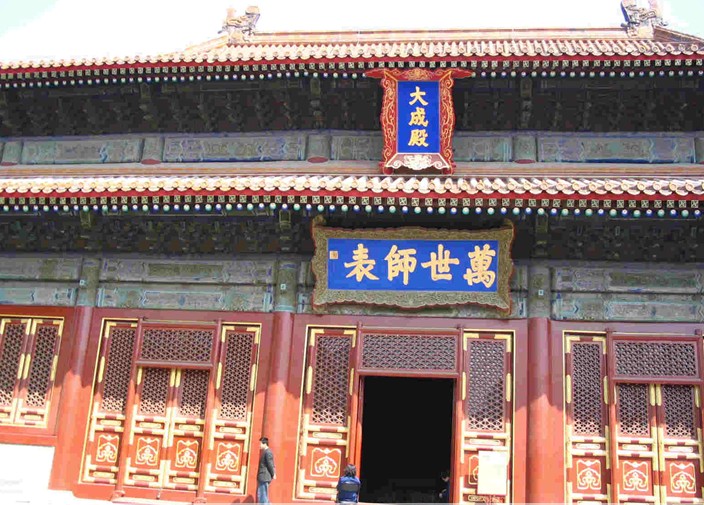 全國重點(diǎn)文物保護(hù)單位。位于北京城內(nèi)東城區(qū)國子監(jiān)街。占地2.2萬平方米。歷代多次重修,為元、明、清三代祭孔建筑,又名"先師廟"。廟坐北朝南,大門稱先師門,仍保持元代風(fēng)格。前有琉璃壁及下馬碑,進(jìn)門東西有碑亭、神廚、神庫等,并立有元、明、清三代進(jìn)士題名碑118 方,題刻歷代進(jìn)士5萬多名。進(jìn)大成門至第二進(jìn)院,正殿名大成殿,為孔廟主體建筑,面闊9間,進(jìn)深5間,黃琉璃筒瓦重檐廡殿頂,殿前月臺三出陛,殿內(nèi)供奉孔子及"四配"、"十二哲"。殿前有600余年樹齡的古柏一株,名"除奸柏",亦名"觸奸柏"。有古井一口,清高宗賜名"硯水湖"。大成殿后有崇圣祠,自成院落,為祭祀孔子先祖之地。今辟為首都博物館,展出北京地區(qū)出土的歷代珍貴文物。
