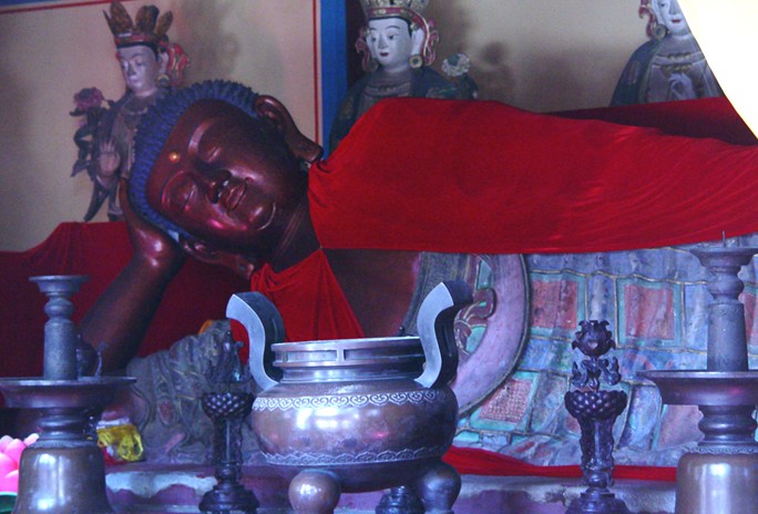 北京西山臥佛寺(Wofo Temple) 由于寺內(nèi)有一尊巨大的釋迦牟尼銅像、臥佛寺由此而得名。臥佛身長(zhǎng)5.2米,用銅25000公斤 、鑄佛用工7000人。銅佛作睡臥式,頭西面南側(cè)身躺在一座榻上,左手平放在腿上,右手彎曲托首頭部。據(jù)說(shuō)這是釋迦牟尼的紀(jì)念像。旁邊站著12尊小佛像,是他的12個(gè)弟子。他們的面部表情沉重悲哀,構(gòu)成一幅釋迦牟尼向12弟子囑咐后事的景像。殿的正面墻上掛一塊"得大自在”的橫匾,意思是得到人生真義也就得到最大自由。殿門(mén)上方亦有橫匾,書(shū)有"性月恒明”,意為佛性如月亮,明亮興輝永照。