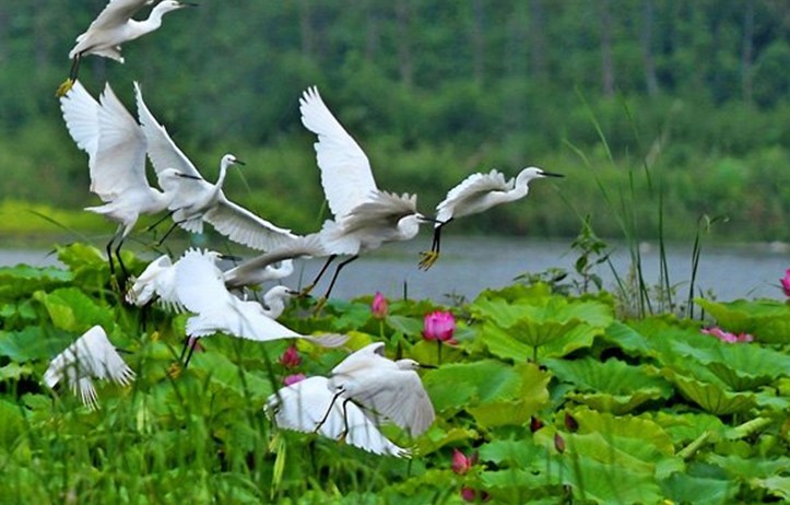 12.著名的植物群落:濕地植被以禾本科、菊科、莎章科、豆科、寥科和眼子菜科為主的植物構成。主要植物群落有:蘆葦群落、茄群落、蓮群落等挺水植被帶;杏菜群落、菱角+芡實群落等浮葉根深植被帶;馬來眼干菜、微齒眼子菜群落、苦草植物群落等沉水植被帶,水生植被蓋度達89.9%,有“水下森林”的美譽。受國家一、二、三級保護的植物主要有水蕨、粗梗水蕨、中華秸縷草和野大豆等9種。