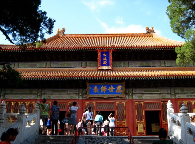 從杏壇北望,在雙層石欄的臺基上一座金黃色的大殿突兀凌空,雙重飛檐中海藍色的豎匾上木刻貼金的群龍緊緊團護著3個金色大字“大成殿”。字徑1米,為清雍正皇帝手書。大成殿是孔廟的主殿,高24.8米,闊45.78米,深24.89米,重檐九 脊,黃瓦飛甍,周繞回廊,和故宮太和殿、岱廟宋天貺殿并稱為東方三大殿。大殿結構簡潔整齊,重檐飛翹,斗栱交錯,雕梁畫棟,金碧輝煌,藻井枋檁飾以云龍圖案,金箔貼裹,祥云繚繞,群龍競飛。四周廊下環立28根雕龍石柱,均以整石刻成。柱高5.98米,直徑0.81米,承以重層寶裝覆蓮柱礎,原為明弘治十三年(公元1500年)敕調徽州工匠刻制,清雍正二年火 后重刻。兩山及后檐的18根八棱磨淺雕石柱,以云龍為飾,每面淺刻9條團龍,每柱72條,細心的工匠在石柱上記下了雕刻的龍的總數,共1296條。前檐的10根為深浮雕,每柱兩龍對翔,盤繞升騰,中刻寶珠,四繞云焰,柱腳綴以山石,襯以波濤。10根龍柱兩兩相對,各具變化。無一雷同,造型優美生動,雕刻玲瓏剔透,刀法剛勁有力,龍姿栩栩如生。這是曲阜獨有的石刻藝術瑰寶,據說清乾隆皇帝來曲阜祭祀孔子時,石柱均用紅綾包裹,不敢被皇帝看到,恐怕皇帝會因超過皇宮而怪罪。大成殿的建筑藝術,充分顯示了我國勞動人民的才華和智慧。 大成殿內正中供奉孔子塑像,坐高3.35米,頭戴十二旒冠冕,身穿十二章王服,手捧鎮圭,一如古代天子禮制。兩側為四配,東位西向的是復圣顏回和述圣孔伋,西位東向的是宗圣曾參和亞圣孟軻。再外為十二哲,東位西向的是閔損、冉雍、端木賜、仲由、卜商、有若,西位東向的是冉耕、宰予、冉求、言偃、顓孫師、朱熹。四配塑像坐高2.6米,十二哲塑像坐高2米,均頭戴九旒冠,身穿九章,服,手執躬圭,一如古代上公禮制。塑像都置于木制貼金神龕內,孔子像單龕,施十三踩斗栱,龕前兩柱各雕一條降龍,繞柱盤旋,姿態生動,雕刻玲瓏,異常精美。四配十二哲兩位一龕,各施九踩斗栱。龕前都有供桌、香案、擺滿祭祀時使用的籩、豆、爵等禮器。殿內還陳列著祭祀孔子時中和韶樂樂器和舞具。殿外懸有10塊匾額、3副對聯,門外正中是清雍正皇帝題書的“生民未有”匾額,殿內正中是康熙皇帝題書的“萬世師表”和光緒皇帝題書的“斯文在茲”匾額,南面懸掛著乾隆皇帝題書的“時中立極”等匾額。每塊匾額長6米多,高約2.6米,雕龍貼金,精美華麗。