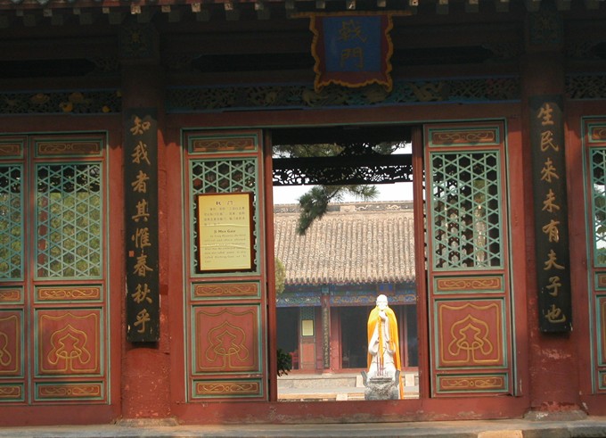 大成殿東西兩側的房子叫“兩廡(wǔ)”,是后世供奉先賢先儒的地方這配享的賢儒大都是后世儒家學派中著名的人物,如董仲舒、韓愈、王陽明等。在唐朝僅有20余人,經過歷代增添更換,到民國時,多達156人。這些配享的人原為畫像,金代改為塑像,明成化年間一律改為寫有名字的木制牌位,供奉在一座座的神龕中。現在兩廡中陳列著歷代石刻。