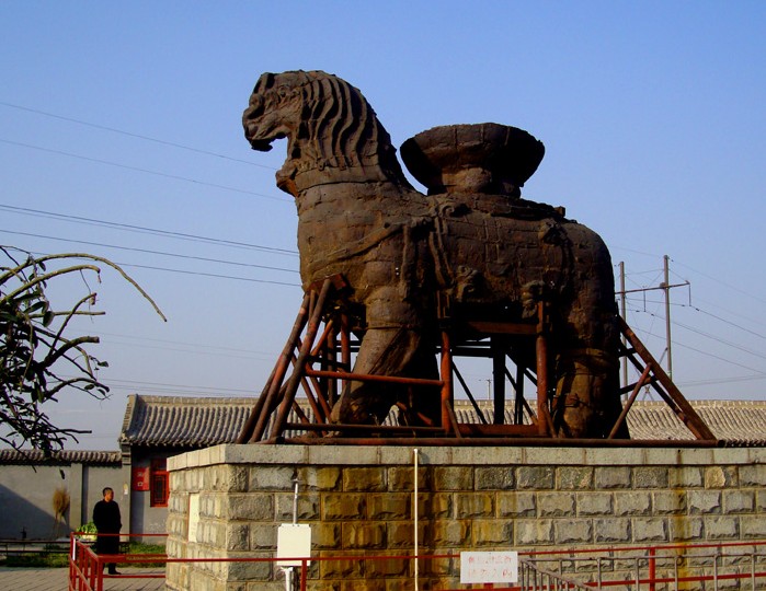 河北滄州鐵獅子鑄于后周廣順三年(公元953年),距今已有一千多年的歷史,采用“泥范明澆法”鑄成,具有較高的歷史科學和藝術價值,為全國重點文物保護單位。通寬5.35米,身長6.30米,身高6.6米,體寬3.0米,重約40噸,素有“獅子王”的美譽,一千多年來,它飽經滄桑,在古滄州,它曾被當成神物供奉,享盡了香火;在烽火連天、哀鴻遍野的戰(zhàn)亂年代,又經受了刀戈的砍殺,在獅體內外斑痕累累。