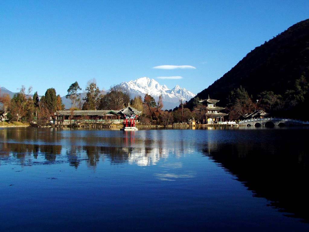 黑龍潭公園位于昆明北郊的龍泉山五老峰下,(亦稱龍泉山麓,太極山、五老山), 昆明黑龍潭占地面積91.4公頃,距離市區約17公里。這里古木參天,泉壑幽邃,修竹茂林,潭深水碧,景色幽深。民間傳說有黑龍王潛藏于此,故稱黑龍潭亦稱龍泉山麓,距離市區約17公里。黑龍潭內有罕見的大型梅園,是昆明的賞梅勝地,稱為“龍泉探梅”。園內的“唐梅”相傳由南詔移植過來,同安寧漕溪寺的“元梅”被認為是云南最珍貴的古梅。在黑龍潭內還有這樣的奇怪現象,潭以中間的石橋為界一分為二,一清一濁,清濁之水互不相融,據說連魚兒都互不過界,頗為神奇。黑龍潭是有名的道教勝地,分為上下兩觀,從漢代的黑水祠演變而來。上觀始建于唐宋時期,始稱龍泉觀,下觀始建于明代,俗稱黑水宮。1997年,黑龍潭游覽區占地3.6公頃。1999年,黑龍潭有風景林51.4公頃,植有各種喬灌木12萬多株。梅園28.5公頃,地栽梅5794株,盆栽梅1725盆。庭園占地6.9公頃,有喬木3973株,灌木48660株,修竹306叢。 1978年建苗圃,占地5.6公頃。建有杜鵑谷,植各種杜鵑10萬多株。1998年又新辟一期綠化工程,占地33公頃,游覽區擴大到45.4公頃。園內有昆明市綠化委員會掛牌保護的古樹名木18株,是昆明市存有古樹名木最多的風景名勝區。麗江黑龍潭始建于乾隆二年(1737),其后乾隆六十年、光緒十八年均有重修記載。舊名玉泉龍王廟,因獲清嘉慶、光緒兩朝皇帝敕封“龍神”而得名,后改稱黑龍潭。詩云:“泉渙渙兮漣漪,問何時最是可人?須領略月到天心,風來水面;亭標標而矗立,看這般無窮深致,應記取云飛畫棟,雨卷珠簾。”黑龍潭以其天生麗質,名列《中國名泉》、《中國風景名勝》等書,誠不虛也。迎面見有一座涂金繪彩的牌樓,門口四尊石獅,肌理秀美,威武雄壯,過去守護木氏土司衙門,1966年遷此守護玉泉。進門往右,但見垂柳飄指,一潭澄碧,樹底天光云影,樹梢樓臺隱現。沿潭右堤至鎖翠橋,橋上古人有聯云:“驚濤撼樹飛晴雪,未雨垂虹臥曲波。”它生動地描繪了橋邊景致。右邊橋下三孔飛瀑,水花四濺,上觀景區濤聲如雷,流向古城,玉水河畔,楊柳依依,濃蔭蔽日。往橋的左邊看,一座五孔石拱橋,長虹臥波一般,將潭一分為二,玲瓏俊美的一文亭、得月樓分別屹立內外潭心,四面臨水,有橋與岸上相連。此樓始建于清光緒二年(1876年),樓名取自古人對聯“近水樓臺先得月、向陽花木早逢春”中三字。1963年重建時,郭沫若為該樓題寫了匾額“得月樓”三字及兩[1]副對聯。一副是集毛澤東詩詞句:春風楊柳萬千條,風景這邊獨好;飛起玉龍三百萬,江山如此多嬌。另一副是郭老撰書的楹聯:龍潭倒映十三峰,潛龍在天,飛龍在地;玉水縱橫半里許,墨玉為體,蒼玉為神。全聯僅三十字,卻寫出了麗江黑龍潭的神韻,書法遒勁而灑脫奔放,為公園增色不少。遠處玉龍雪山倒遇潭中,可見“雪山四萬八千丈,銀屏一角深插底”奇景。象山半壁也映入水中,使黑龍潭山中有水,水中有山,山水相映,景色無比秀麗。