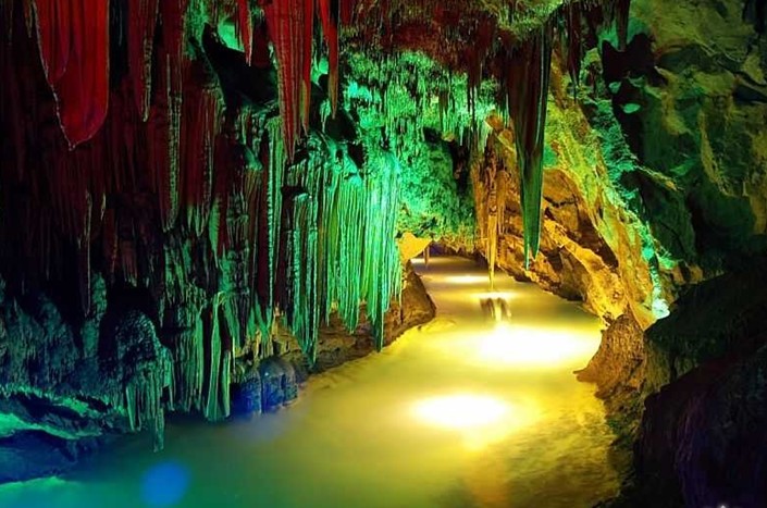 通往水洞的碼頭,千余平方米的水面,宛如一幽靜別致的“港灣”,燈光所及,水中游船、洞中石景倒映其中,使人如入仙境。從護岸石階拾級而下,通過長廊從碼頭上船,即可暢游水洞。水洞全長5800米,現已開發2800米,面積3.6萬平方米,空間40余萬立方米,最開闊處高38米,寬70米。大廳正面有1000多平方米的水面,有碼頭可同時停泊游船40艘,泛舟則可暢游水洞,欣賞水洞之大、水洞之長、水洞之深、飛瀑之美,然后,你不得不驚嘆:"鐘乳奇峰景萬千,輕舟碧水詩畫間,鐘秀只應仙界有,人間獨此一洞天"。洞內空氣通暢,水流終年不竭,每晝夜流量1.4萬噸,平均水深1.5米,最深處7米,洞內恒溫12℃.河道曲折婉蜒,河水清澈見底,洞內分 “三峽”、 “七宮”、 “九彎”,故名“九曲銀河”。水域沿洞體展開,縱深達2.3公里,而且時闊時狹,迂回曲折,洞內鐘乳石、石筍與石柱多從裂隙攢擁而出,不假雕飾即形成各種物象。這些物象光怪陸離,極具觀賞性。從碼頭乘游艇向里行,可依次欣賞飛泉迎客、寶瓶口、海潮、寶蓮燈、群猴、福壽星、玉米塔、寶鼎、仙丹石、龍角巖、劍群、麒麟巖、瀑布、獨角犀、春筍、垂幕、三塔、斜塔、玉象、倚天長劍、孔雀巖、雪山等奇景。它們維妙維肖,形象逼真。特別是玉米塔、玉象和雪山三景,更是名實相符,幾可亂真。銀河兩岸鐘乳林立,石筍如畫,千姿百態,光怪陸離,洞頂空窿鐘乳高懸,晶瑩斑斕,神趣盎然,沿河景點達100余處,千姿百態, 各具特色,泛舟其中,如臨仙境,這是水與石渾然天成的神秘洞穴,是迄今世界上已發現的最長可乘船游覽的地下暗河.