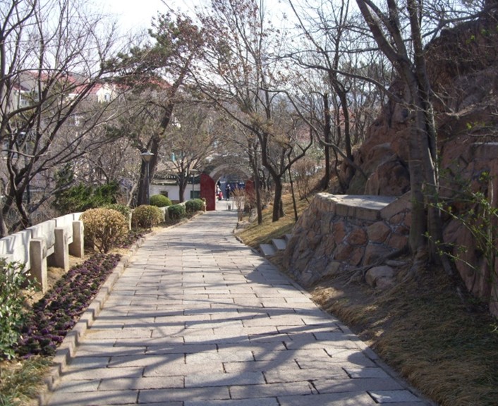 我們從小魚山的大門抬階而上,看到的這個亭子是一個挑檐式的六角亭,在亭內可以把碧波蕩漾的匯泉灣一覽無余,故得名“碧波亭”。“碧波亭”的匾額“碧波”二字是由著名的國畫藝術大師吳作人手書的。大家看遠處的山上有三棟紅色蘑菇樓宛如三柄熊熊燃燒的火炬,那是青島市十大山頭公園之一的信號山公園。在半山腰綠樹叢中的那棟別具特色的建筑是青島市迎賓館,原是“德國總督府官邸”。我們再由“碧波亭”拾階而上,站護欄邊可以看到右下邊有兩幢民族式建筑,一座形如城樓,一座貌似宮殿,那就是青島市海產博物館。