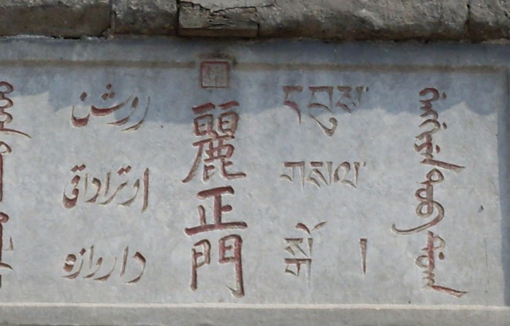 門前列石獅和下馬碑,迎面有紅照壁,門上有閣樓,下有3門,高敞宏偉。中門上方有乾隆題額“麗正門”三字,取《易經(jīng)》“日月麗乎于天”之意,用漢、滿、蒙、藏、維五種文字刻成。它和門內(nèi)上方乾隆題詩“兩字新題標麗正,車書恒此會遐方”,象征著國內(nèi)各民族團結(jié),國家強盛、統(tǒng)一。
