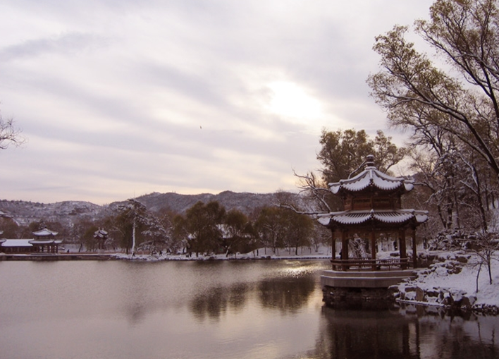 每逢中秋佳節(jié)之際,天高氣爽,登臨“月臺”賞月,但見園內(nèi),老樹蒼勁,枝杈縱橫。一輪明月冉冉升起,把一片銀輝灑向大地,山莊頓時銀裝素裹,更顯得清澈靜謐。文津閣假山的造型藝術(shù),集中了米翁寶晉齋和范氏天一閣之長,運用傳統(tǒng)疊山技法,結(jié)合北方雄壯的特點,風(fēng)格一反南方小巧玲瓏之態(tài),而是雄偉、渾厚、氣勢磅礴的藝術(shù)作品。