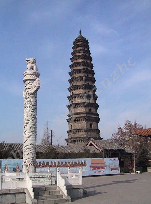 七寶塔在山西平順縣城西北23公里大云寺前。周顯德元年(公元 954年)建。通體用堅硬青石雕造。原為七層,現(xiàn)存五層,高為六米。下三層平面八角形。第一層雕寶裝蓮花、獅子、麒麟、飛馬等。第二層雕伎樂人,體態(tài)輕盈,舞姿優(yōu)美,伴奏者栩栩如生。第三層轉角處雕絞龍柱,回旋盤繞。塔檐下飛鳳、飛仙、共命鳥等變化多姿。