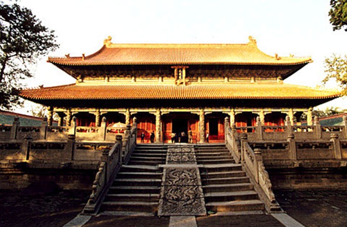 大成殿是孔廟的正殿,也是孔廟的核心。唐代時稱文宣王殿,共有五間。宋天禧五年(公元 102年)大修時,移今址并擴為七間。宋崇寧三年(公元1104年)徽宗趙佶取《孟子》:“孔子之謂集大成”語義,下詔更名為“大成殿”,清雍正二年(公元 1724年)重建,九脊重檐,黃瓦覆頂,雕梁畫棟,八斗藻井飾以金龍和璽彩圖,雙重飛檐正中豎匾上刻清雍正皇帝御書“大成殿”三個貼金大字。殿高 24.8米,長45.69米,寬24.85米,坐落在2.1米高的殿基上,為全廟最高建筑,也是中國三大古殿之一。