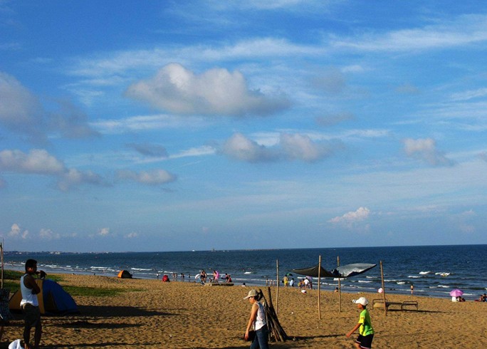 這里的海灘特別平整,每天可以看到兩次漲潮落潮奇觀:落潮時海水迅速消失,僅剩下裸露的萬畝灘涂和來不及回到大海的魚蝦蟹貝;漲潮時海水八方齊涌,萬畝灘涂迅即淹沒,極為壯觀。