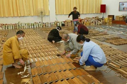 這里還存有用血書寫的經書557冊。這是涌泉寺“三寶”之一。這些血經系清光緒年間,華能和尚刺臂血,由信士王谷楷書“大乘般若波羅密真經”全部,定慧大師刺血、克定書寫“佛說四十二章經”等。用鮮血寫成幾百冊佛經,需要很長的時間和大量的鮮血,這就需要刺血的人長期不吃鹽,血在書寫時才不會很快凝固。這些佛經中,一部分字呈鮮紅色,是因為在血中調了朱砂;一部分暗紅色,則是不調朱砂的。血書數百冊佛經,表達了血書人十分的虔誠和不凡的毅力。