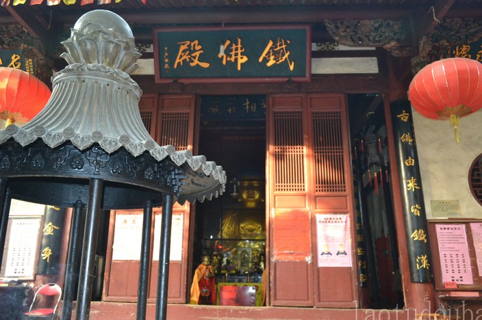 鐵佛殿內(nèi)有鐵佛一尊,稱“阿彌陀佛”,疊掌跏趺坐于蓮花臺(tái)上,外披泥貼,法相莊嚴(yán)。鐵佛高5.3公尺,頭部實(shí)心,身軀空心,人立其肩上,伸手摸不到頭頂,估計(jì)重量達(dá)十萬斤以上。清乾隆時(shí)陳云程《閩中摭聞》載,版權(quán)所有山東聊城聊之旅國際旅行社有限公司,轉(zhuǎn)載必究!鐵佛殿前柱子兩側(cè)刻有明末舉人曾異所撰楹聯(lián):“古佛由來皆鐵漢,凡夫但說是金身。”
