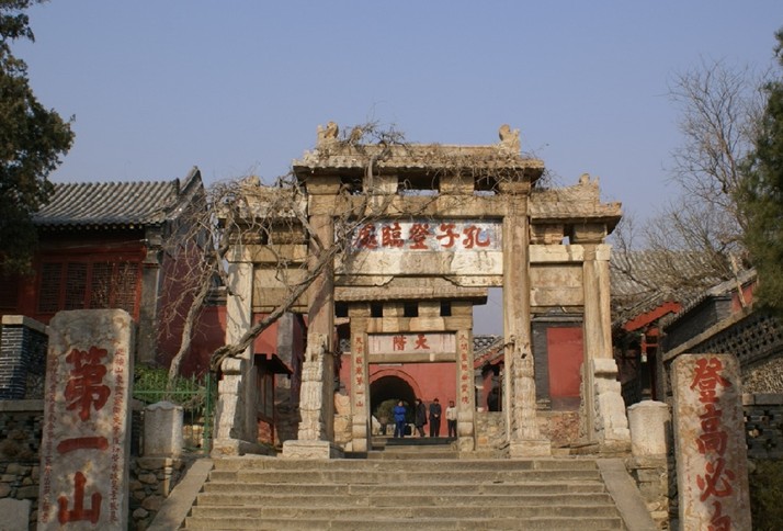 孔子登臨處位于泰山一天門北,為四柱三門式跨道石坊。古藤掩映,典雅端莊,額題“孔子登臨處”五大字。明嘉靖三十九年 (1560)始建。柱聯(lián)曰:“素王獨步傳千古,圣主遙臨慶萬年”。坊兩側分立兩碑,東為明嘉靖間濟南府同治翟濤題“登高必自”碑;西為巡撫山東監(jiān)察御史李復初題“第一山”碑。北側為兩柱單門的“天階”坊。