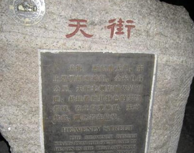 進了南天門再上兩層臺階就是天街,天街自古以來就似懸在天上的一條街市。古代的香客,現在的游人都對這條街存有深刻的印象。在長約千米的天街上布滿了賓館、飯店、商鋪。據記載,天街從清代就開始繁華,當時的一些店鋪老板用實物作為招牌,如“棒槌”、“木碗”、“鸚鵡”等。