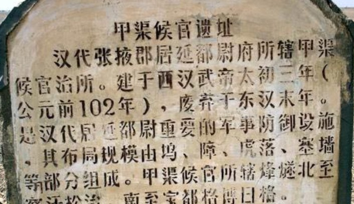 甲渠候官遺址俗稱破城子,位于額濟納旗南24公里,納林、伊肯河之間的戈壁灘上。為漢代居延都尉西部防線甲渠塞之長——甲渠候駐所。發掘前,遺址大部分為砂礫掩沒。往西300米,南北排列“一”字形烽燧和雙重塞墻遺跡。